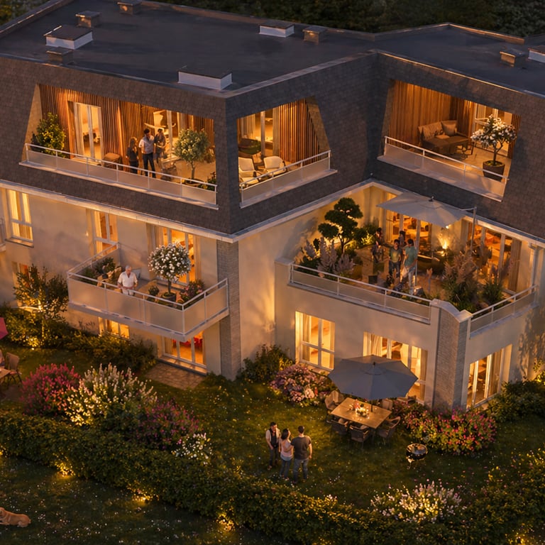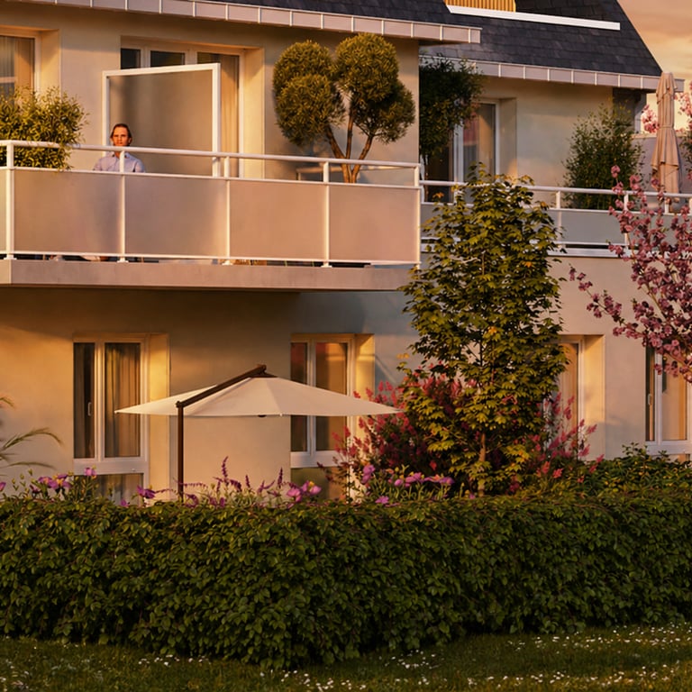 La galerie présente également les différents espaces extérieurs privatifs proposés aux futurs résidents. Selon les logements, les appartements bénéficient de jardins privatifs en rez-de-chaussée, de balcons ou encore de grandes terrasses permettant de profiter pleinement des beaux jours. Ces images permettent de mieux se projeter dans les futurs espaces de vie et de visualiser les volumes extérieurs proposés.